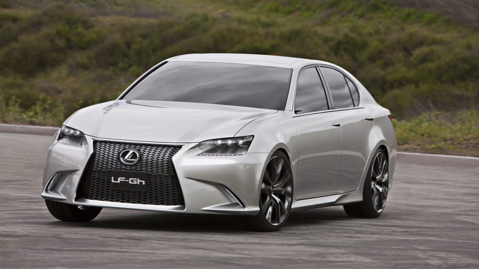 The Lexus spindle grille is shown at the NAIAS, framing the front of the LF-Gh concept car, itself a preview of the fourth-generation GS executive sedan. The signature spindle design is expressed with an expansive one-piece mesh grille framed by a chrome strip around the outer edge with a unique concave hexagonal shape.